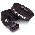 Die StreetGains Holz-Turnringe werden mit zwei hochbelastbaren Nylongurten geliefert. Diese extra langen Gurte haben jeweils eine Länge von 550 Zentimetern. Dadurch lassen sich die Holzringe einfach an einer Klimmzugstange, einem Baum, einem Basketballkorb oder einem anderen Objekt befestigen. Was dieses Ring-Set außerdem einzigartig macht, ist die Längenangabe auf beiden Gurten. Das sieht nicht nur ästhetisch sehr gut aus, sondern erleichtert auch das Aufhängen der Ringe in genau derselben Höhe. Die Gurte sind mit SafeLock-Stahlverschlüssen ausgestattet. Diese verhindern, dass die Ringe während des Gebrauchs herunterrutschen. Außerdem sorgt der integrierte SmartHold-Klettverschluss dafür, dass der überschüssige Teil der Bänder aufgerollt werden kann, damit sie nicht im Weg hängen. Die Straps sind mit einem erhabenen StreetGains-Logo aus Gummi versehen.